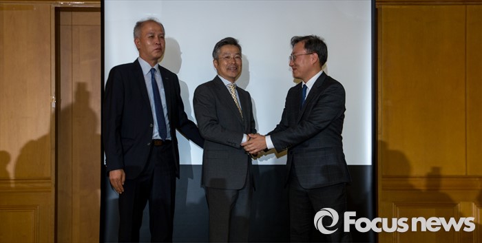 | △ 윤호영(오른쪽) 카카오 부사장이 30일 오전 서울 중구 은행연합회 세미나실에서 인터넷전문은행 세부사업 계획 발표를 마친 뒤 김인회 K뱅크 컨소시엄TF팀장과 악수 하고 있다. 사진 왼쪽은 이용우 한국투자금융지주 전무. <사진제공=포커스뉴스> |