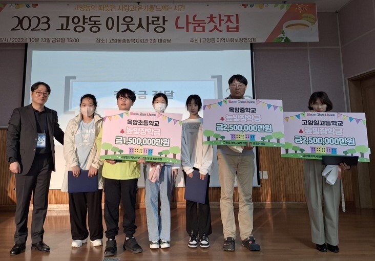 장학금 대상자는 학교장의 추천을 받은 저소득층 가정의 우수 학생이며, 고양동 지역사회보장협의체의 회의를 거쳐 최종 선발되었다. 지원 규모는 초등학생 10가구 30만 원·중고등 및 대학생 14가구 50만 원으로 총 일천만 원이다.