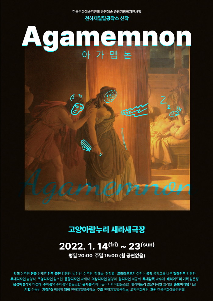 [부자동네타임즈 김인수기자] 고양문화재단(대표이사 정재왈)은 천하제일탈공작소와 ‘2022 아람콘텐츠교류협력사업’의 첫 번째 공연으로 탈춤극 아가멤논을 1월 14일(금)부터 23일(일)까지 고양아람누리 새라새극장에서 선보인다.
