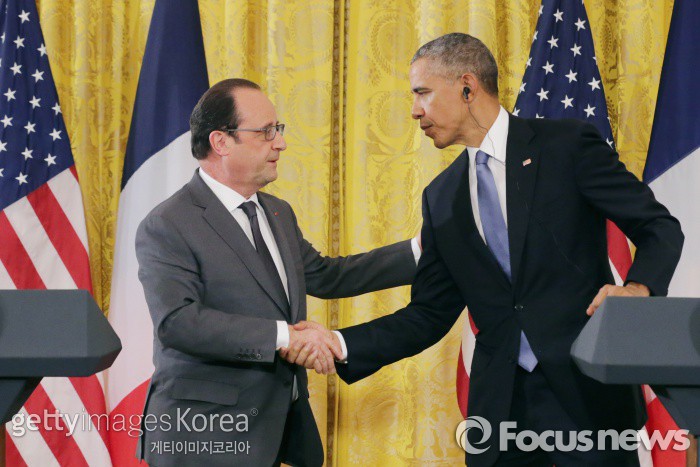 | △ (워싱턴DC/미국=게티/포커스뉴스) 지난달 24일(현지시간) 미국 백악관에서 프랑수아 올랑드 프랑스 대통령(왼쪽)과 버락 오바마 미국 대통령이 악수를 하고 있다. 지난달 13일 발생한 파리 도심 테러 이후 유럽 국가들과 미국의 이슬람국가(IS) 격퇴 연합전선이 본격화하고 있다. ⓒ게티이미지/멀티비츠 photo@focus.kr |