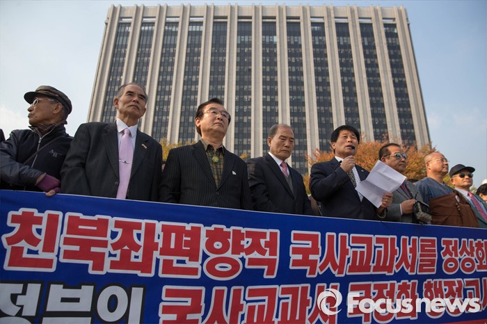 (서울=포커스뉴스) 역사교과서 국정화가 확정고시 된 3일 오전 서울 종로구 정부서울청사 앞에서 정부의 한국사 교과서 국정화 확정고시를 지지하는 보수단체 회원들이 기자회견을 하고 있다.