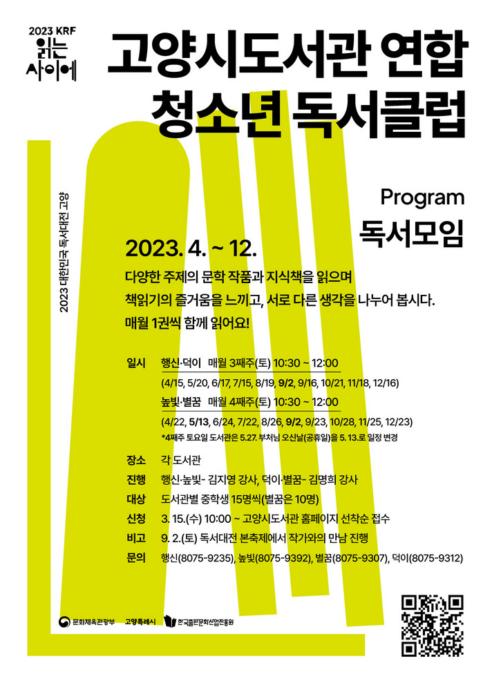 [부자동네타임즈 김인수기자] 고양특례시(시장 이동환)가 ‘2023 대한민국 독서대전’개최를 기념해 오는 4월부터 12월까지 청소년을 대상으로 고양시 도서관 연합 청소년 독서클럽을 운영한다.