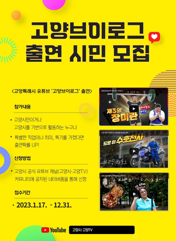 [부자동네타임즈 김인수기자] 고양특례시(시장 이동환)가 고양시 공식 유튜브 채널 고양TV의 ‘고양브이로그’ 프로그램에 출연할 시민을 연중 모집한다.