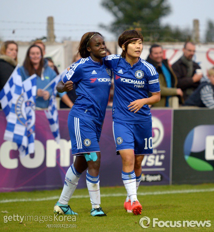 | △ <스테인스/영국=게티/포커스뉴스> 첼시 레이디스 소속 지소연이 5일(한국시간) 홈에서 열린 선더랜드 레이디스와의 최종 라운드에서 선제골을 넣은 뒤 팀 동료 에니올라 알루코로부터 축하를 받고 있다. (C)게티이미지/멀티비츠 |