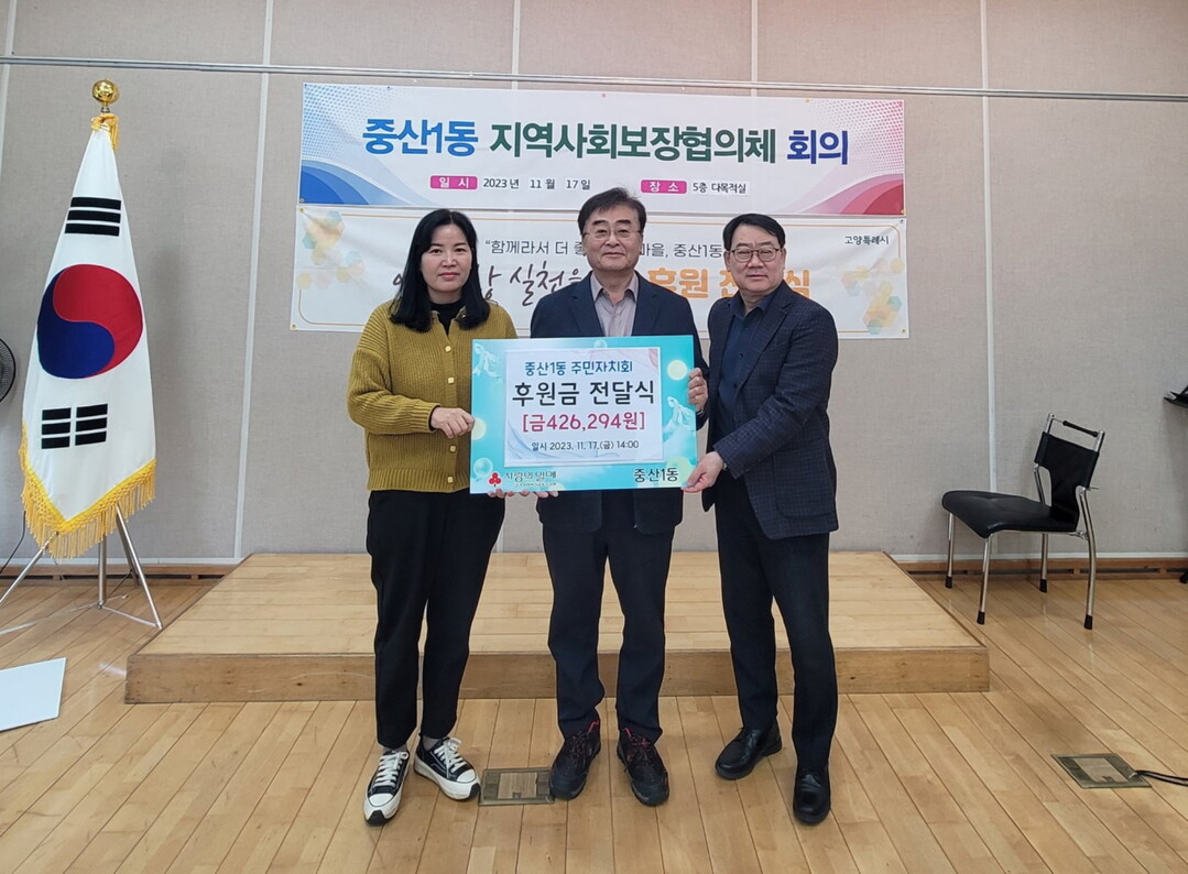 [부자동네타임즈 = 김인수 기자] 고양특례시 중산1동은 지난 17일 오후 2시, 중산1동 주민자치회 주관으로 개최한 ‘으랏차차 마을축제’ 수익금 일부를 중산1동 지역사회보장협의체로 기부하는 후원 전달식을 개최했다.
