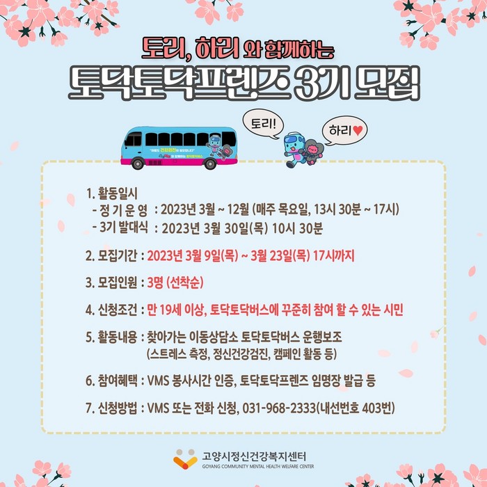 [부자동네타임즈 김인수기자] 고양시정신건강복지센터는 토닥토닥버스 운영을 위한 토닥토닥프렌즈 3기를 3월 9일부터 3월 23일까지 모집한다.