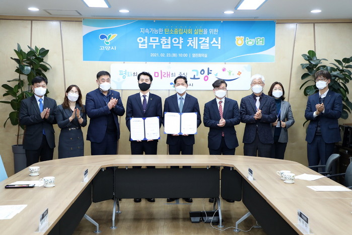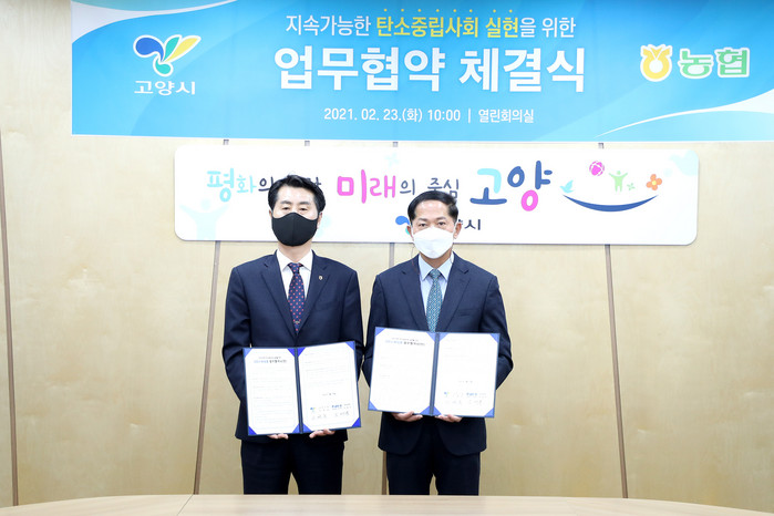 이재준 고양시장과 김재득 NH농협은행 고양시지부장이 참석한 업무협약식에서 두 기관은, 고양형 탄소중립 도시 조성을 위한 저탄소 녹색생활의 저변 확대와 기후위기 대응 홍보 사업 등을 함께 추진하기로 했다.