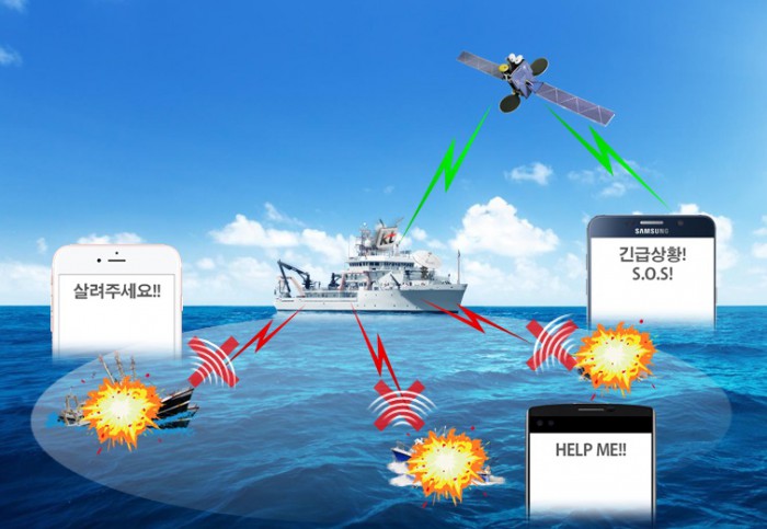 위성 LTE SOS 기지국을 선박에 설치하면 KT SAT의 무궁화위성으로부터 통신신호를 받아 반경 10km의 선박들은 통화가 가능해진다.
