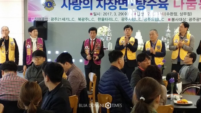 | △국제라인온스협회 B1(광주지구)는 2017년 3월 29일 광주시 수완동 한 식당에서 광주광역시라인온스협회 5개 지구가 협찬한 가운데 광주시 장애인협회원 및 장애인 문화협회 장애우들을 초청하여 '사랑의 자장면·탕수육 나눔 봉사'를 실시하였다 |