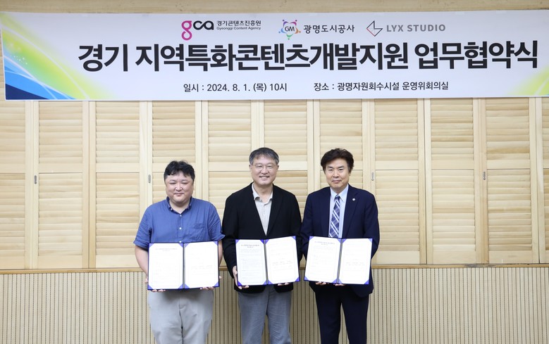 경기콘텐츠진흥원(원장 탁용석, 이하 경콘진), 광명도시공사(사장 서일동), ㈜릭스스튜디오(대표 장정욱, 김현준)은 ‘경기 지역특화 콘텐츠 개발지원’ 사업 공동 추진을 위한 업무협약을 8월 1일 광명동굴에서 체결했다.