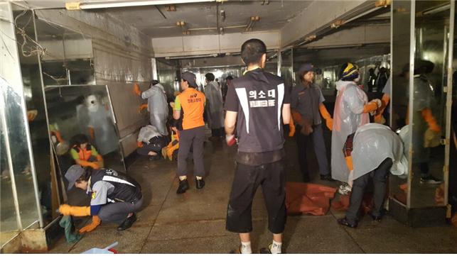 인천시 의용소방대원은 태화시장 인근을 중심으로 침수로 인해 유입된 토사 제거 및 시장주변 부유물 잔해 정리, 가재도구 세척과 시설물 정비 등 이 지역의 신속한 복구를 위해 각종 지원 활동을 실시하였다.