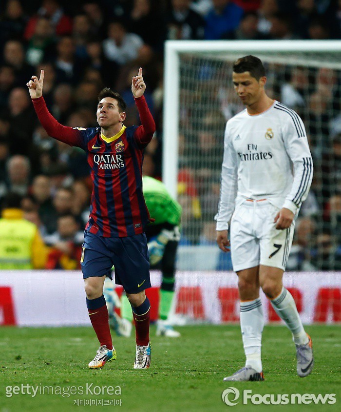| △ <마드리드/스페인=게티/포커스뉴스> 바르셀로나 리오넬 메시(왼쪽)가 2014년 3월24일 새벽(한국시간) 원정으로 열린 레알 마드리드와의 프리메라리가 경기에서 득점에 성공한 뒤 환호하고 있다. (C)게티이미지/멀티비츠 |