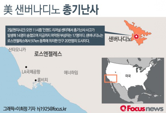 (서울=포커스뉴스) 사망자 14명과 부상자 21명을 낳은 미 캘리포니아주 샌버나디노시 총기난사 사고가 테러와 관련이 있다는 미국 수사당국의 보고가 나왔다.