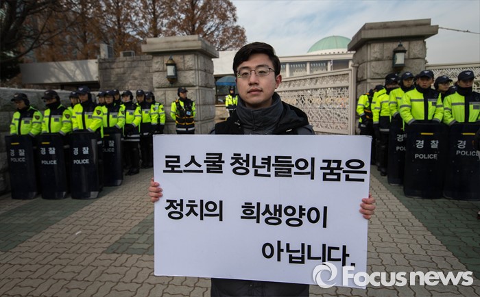 | △ 사법시험 존폐에 관한 논쟁이 격화되고 있는 가운데 9일 오전 서울 여의도 국회 앞에서 서울대학교 로스쿨 2학년에 재학 중인 강태승씨가 '사법시험 폐지 유예 철회' 1인 시위를 하고 있다. <사진제공=포커스뉴스> |