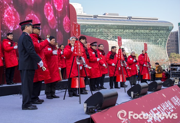 (서울=포커스뉴스) 1일 오전 서울 중구 서울광장에서 열린 '구세군 자선냄비 시종식'에서 박종덕 한국구세군사령관을 비롯한 주요내빈들이 모금 시작을 알리는 시종을 하고 있다. 한국 구세군 자선냄비본부는 이날부터 70억원 모금을 목표로 전국 450여 곳에서 모금 활동을 시작한다.