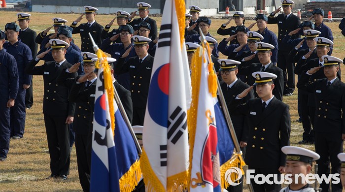 (제주도=포커스뉴스) 1일 오후 제주민군복합항에서 열린 '해군 제주기지전대 창설 및 초대 전대장 취임식'에서 참석 장병들이 거수경례를 하고 있다.