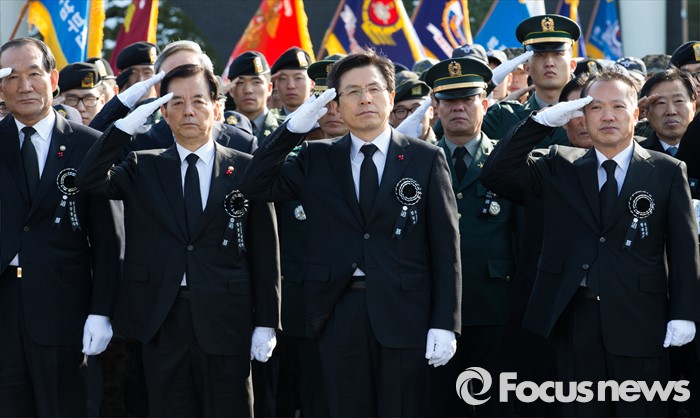 (서울=포커스뉴스) 황교안 국무총리(가운데)와 한민구 국방부장관(왼쪽 두번째)이 4일 오전 서울 동작구 국립현충원에서 열린 6.25 국군 전사자 합동봉안식에서 영현을 향해 경례하고 있다.