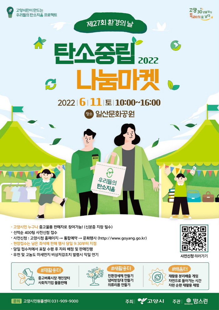 2050 탄소중립 나눔마켓에 참여를 원하는 개인 및 단체, 청소년·어린이는 오는 5월 9일부터 15일까지 고양시 홈페이지 통합예약 프로그램에서 사전 접수하면 된다. 선착순으로 접수된 400팀은 행사 당일 지정된 좌석을 안내 받을 수 있다.