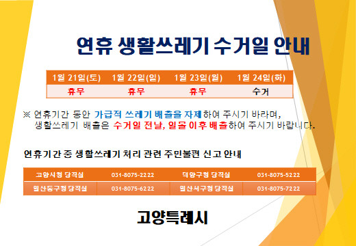 생활폐기물 수거업체 휴무일은 1.21.(토)부터 1.23.(월)까지 3일간이며, 생활폐기물은 연휴 시작 전날인 1.20.(금)과 연휴 마지막 날인 1.24.(화)부터 1.26.(목)까지 집중수거 할 예정이다.