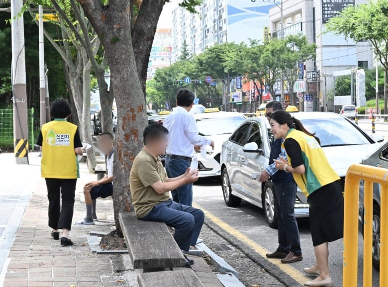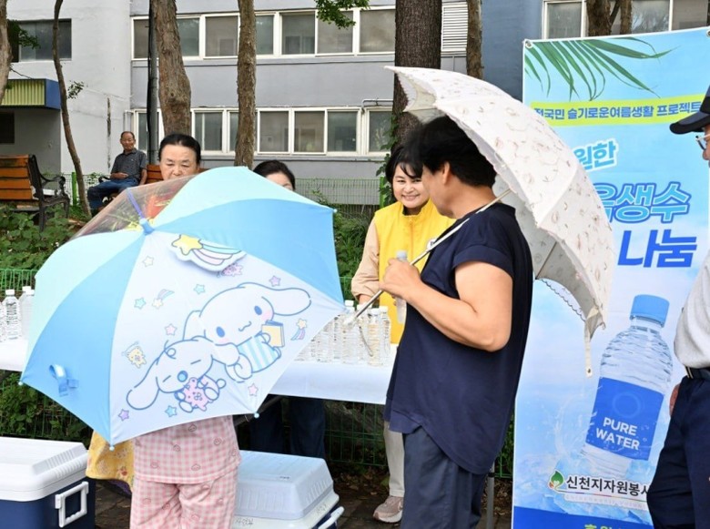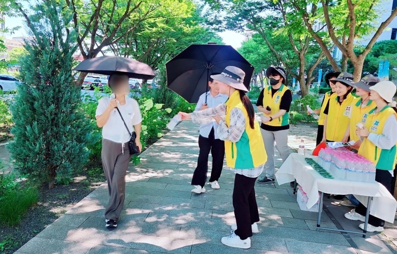 봉사자는 물과 부채를 건네며 “건강하세요”, “시원한 하루 보내세요”라고 시민에게 응원의 메시지를 전했다.
