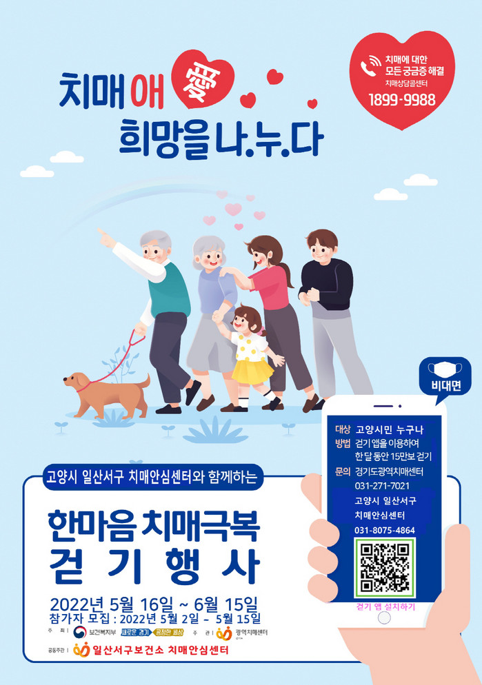 [부자동네타임즈 김인수기자] 고양시 일산서구보건소는 치매환자·가족과 시민이 참여하는 ‘2022년 한마음 치매극복 걷기행사’를 5월 16일부터 6월 15일까지 모바일 앱(워크온)을 활용해 비대면으로 진행한다.