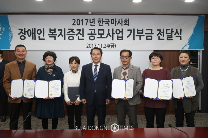 [부자동네타임즈 신동현 기자]마사회는 11월 24일(금) 렛츠런파크 서울(경기도 과천시 소재) 본관에서 ‘2017년 장애인 복지증진 공모사업’ 기부금 전달식을 개최했다. 이번 공모사업에는 230여개 이상의 단체가 지원하여 최종적으로 총 25개소에 기부금 2억 5천만 원이 전달됐다.