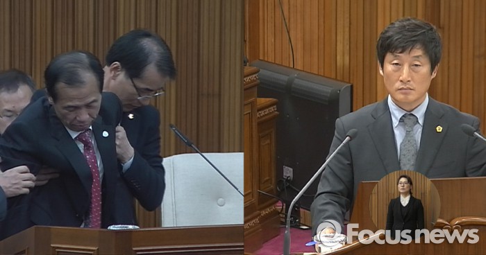 | △ 최문순 강원도지사가 14일 오후 2시30분쯤 제249회 임시회 제2차 본회의에서 진기엽의원의 도정질문 중에 쓰러져 측근들의 부축을 받고 있다. <사진제공=강원도의회> 송승환 기자 songwin21@focus.kr |