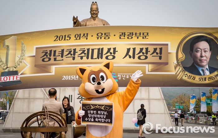 (서울=포커스뉴스) 22일 오전 서울 종로구 광화문 세종대왕 동상 앞에서 열린 '2015 청년착취대상' 시상식에서 신동빈 롯데그룹 회장을 대신해 롯데월드 마스코트 로티가 상장을 받은 후 기념촬영을 갖고 있다.