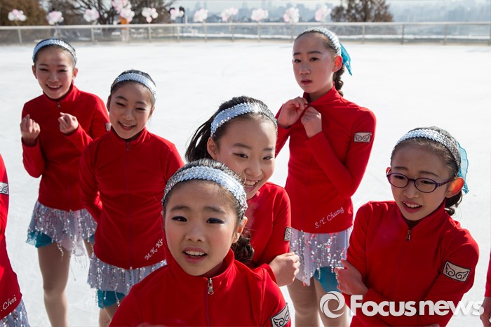 (서울=포커스뉴스) 4일 오전 서울 용산구 그랜드 하얏트 호텔 아이스링크장에서 아이스링크 싱크로나이즈팀 소녀들이 공연 준비를 하고 있다.