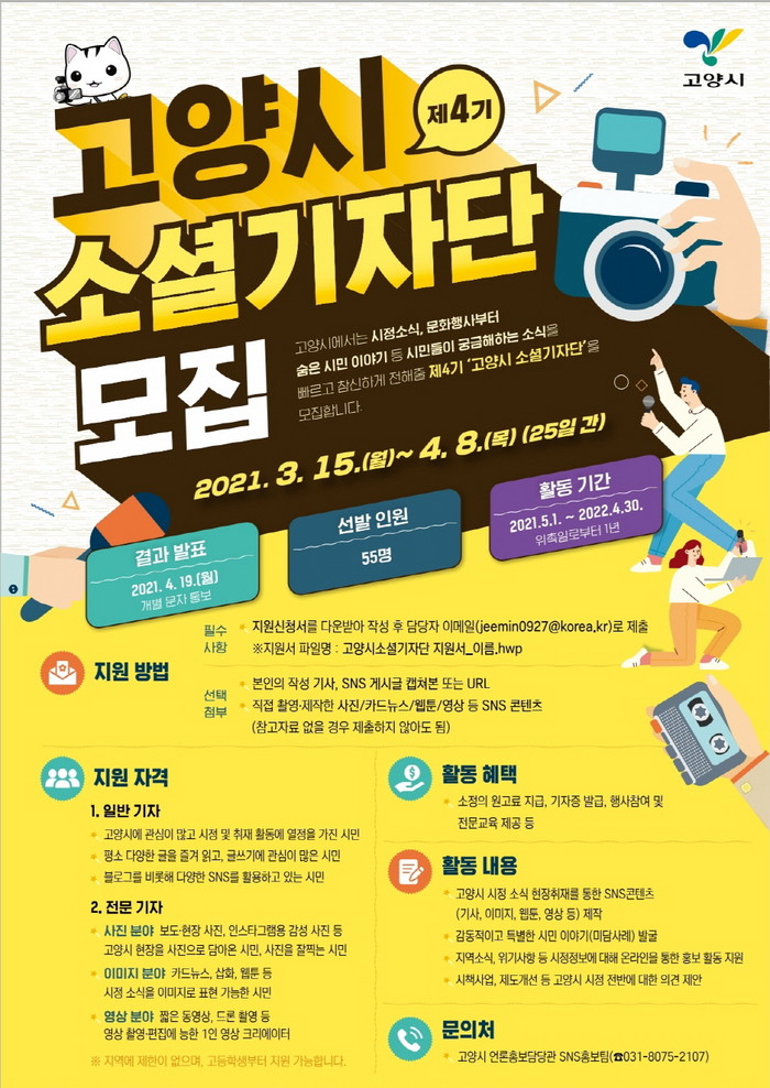 제4기 소셜기자단은 일반 취재기자, 사진·웹툰·영상 등 전문 분야 기자 등 총 55명을 모집한다. 거주지에 상관없이 고양시에 관심이 많고, 글쓰기를 즐겨하며 SNS를 활용할 수 있다면 고등학생부터 누구나 지원할 수 있다.