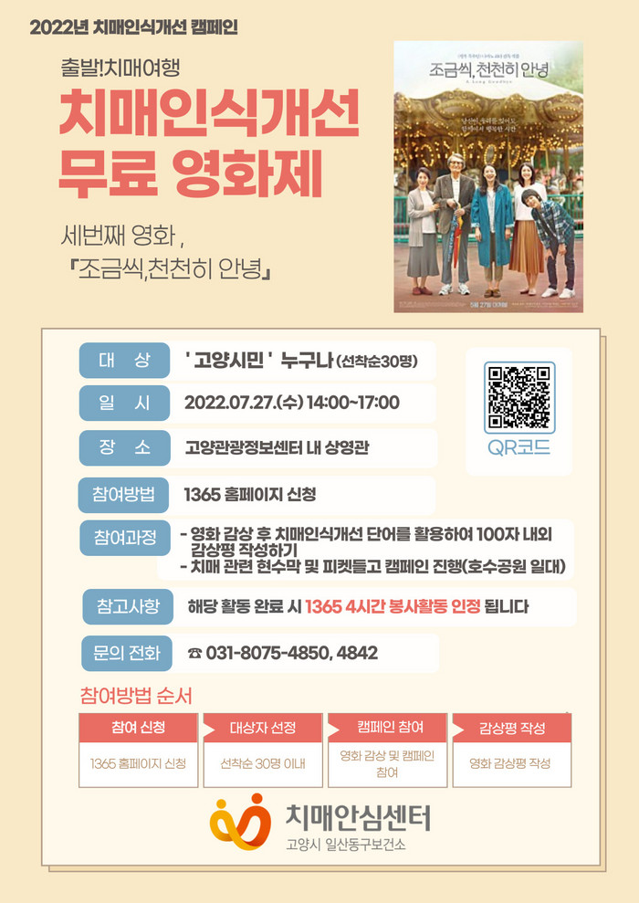 [부자동네타임즈 김인수기자] 고양시 일산동구보건소 치매안심센터가 치매인식개선 영화제‘출발! 치매 여행’의 세 번째 작품을 상영한다. 고양특례시(시장 이동환)가 두 번째 작품 더 파더에 이어 선보이는 영화는 조금씩, 천천히 안녕이다.