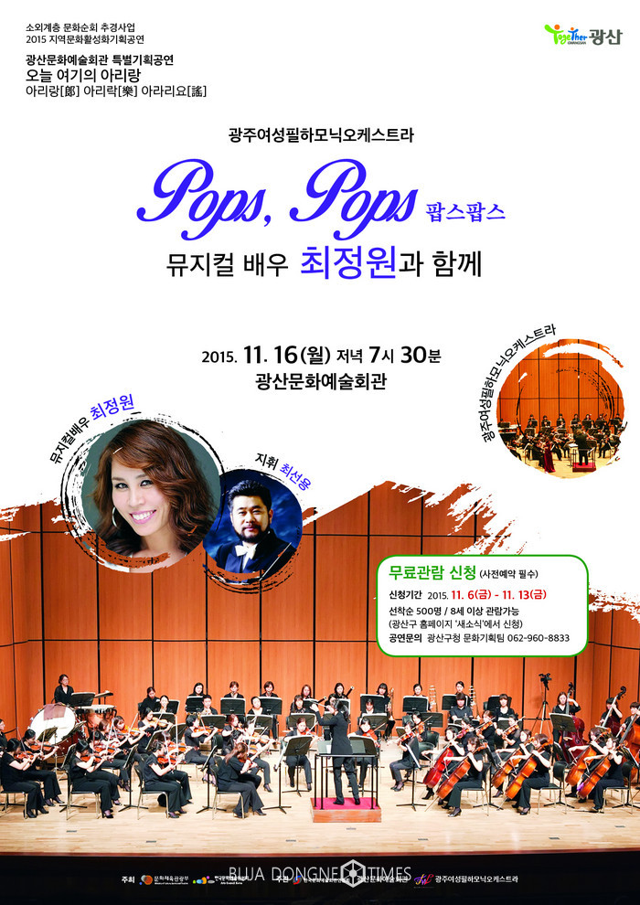 [광주=부자동네타임즈 손권일 기자] 광주광역시 광산구(구청장 민형배)는 이달 16일 오후 7시 30분 광산문예회관에서 광주여성필하모닉오케스트라의 '팝스팝스 뮤지컬배우 최정원과 함께'를 개최한다고 5일 밝혔다.