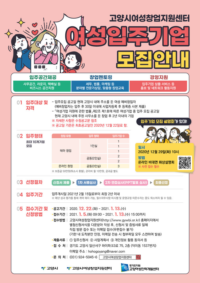 입주신청에 대한 설명 및 안내를 위해 12월 29일 오전 10시에 온라인으로 사업설명회가 개최되며, 참가를 희망할 경우 고양시여성창업지원센터로 사전 접수해 참여할 수 있다. 자세한 사항은 고양시여성창업지원센터로 문의하면 안내받을 수 있다.