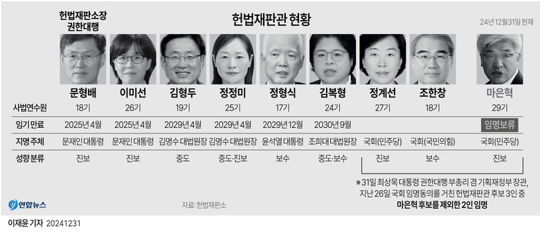 헌법과 헌법재판소법에 따라 재판관 9인 중 3명은 국회가 선출한다. 국회는 정계선·마은혁·조한창 후보자를 선출했으나, 최 대행은 임명을 미루다 지난달 31일 정계선·조한창 재판관만 임명하고 마 후보자의 임명은 보류했다.마 후보자에 대해서는 여야 합의가 확인되지 않았다는 이유에서다.김 변호사는 최 대행이 임명권을 행사하기 전인 지난달 28일, 최 대행이 재판관 임명권을 행사하지 않아 자신이 청구인인 다른 헌법소원 사건 등에서 공정한 헌법재판을 받을 권리를 침해했다며 헌법소원을 냈다.