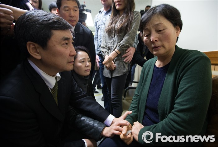 (서울=포커스뉴스) 27일 오후 새정치민주연합 이종걸 원내대표(왼쪽)와 임수경 의원이 서울 종로구 서울대병원 중환자실 로비에 있는 백남기(69세) 씨의 가족들을 만나 위로 하고 있다.