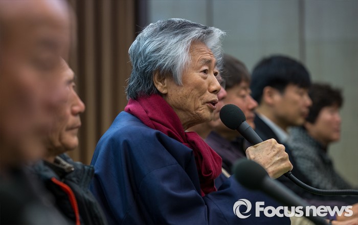 | △ 백기완 통일문제연구소 소장이 4일 오전 서울 중구 프레스센터 기자회견장에서 열린 '12월 5일 범국민대회 국민참여 촉구 기자회견'에 자리해 발언을 하고 있다. <사진제공=포커스뉴스> |