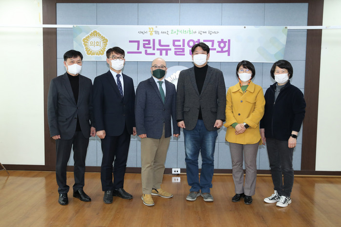 기후위기에 대응하는 그린뉴딜에 대한 산업적 고찰을 위해 구성된 그린뉴딜 연구회는 회장으로 박한기 의원, 부회장은 장상화 의원이 맡고 있으며, 박소정, 박시동, 정봉식 의원이 회원으로 활동하고 있다.