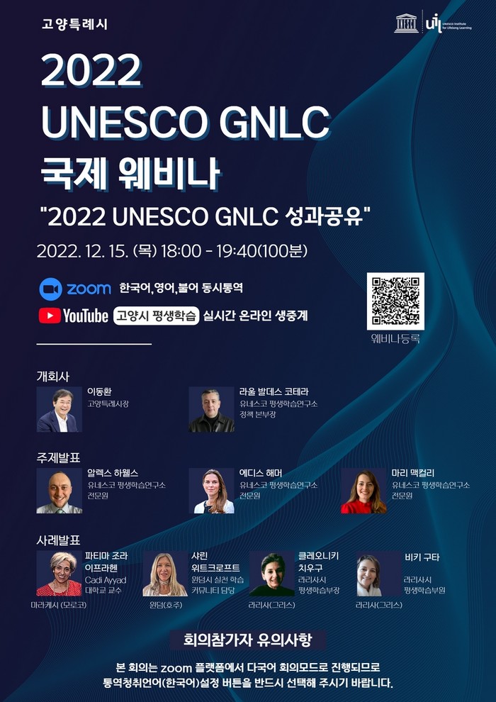 고양시와 유네스코 평생학습연구소(UIL)가 공동 주최하는 이번 웨비나는 UNESCO GNLC 회원도시 76개국 294개 도시가 참여하는 2022년 글로벌 학습도시 활동성과를 공유하고자 마련되었다.