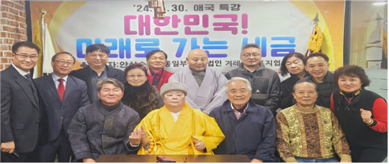| ▲사)겨레사랑복지협의회 이사장 황정길(가운데 좌측), 일경큰스님(가운데), 유삼남 명에총재(가운데우측) |