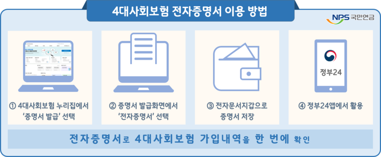 국민연금공단(이사장 김태현)은 국민 편의를 위해 4대사회보험 전자증명서 발급 서비스를 개시하였다고 12일 밝혔다.