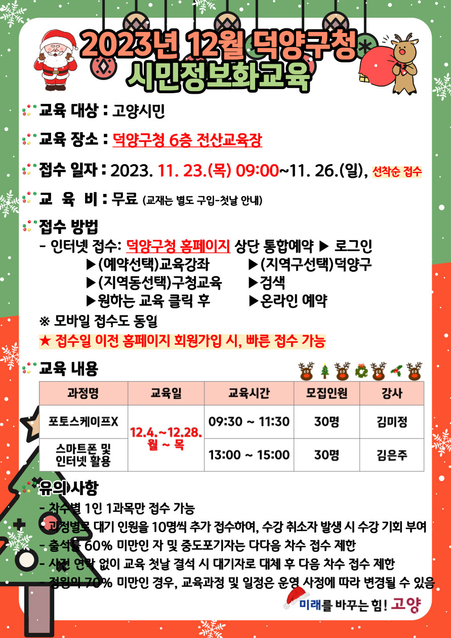 [부자동네타임즈 = 김인수 기자] 고양특례시 덕양구는 고양시민을 대상으로 하는 2023년 제9차 시민정보화교육 접수가 오는 23일 오전 9시부터 진행된다고 밝혔다. 이번 교육이 올해 마지막 교육이다.
