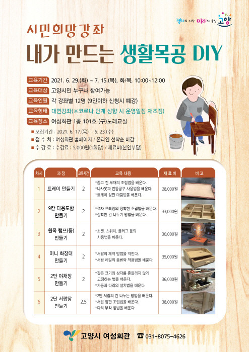 [부자동네타임즈 김인수기자] 고양시 여성회관은 오는 29일부터 ‘내가 만드는 생활목공 DIY’ 강좌를 운영한다. 여성회관은 설문 조사를 통해 시민들이 원하는 강좌를 파악한 후 이번 생활목공 DIY 강좌를 준비했다.