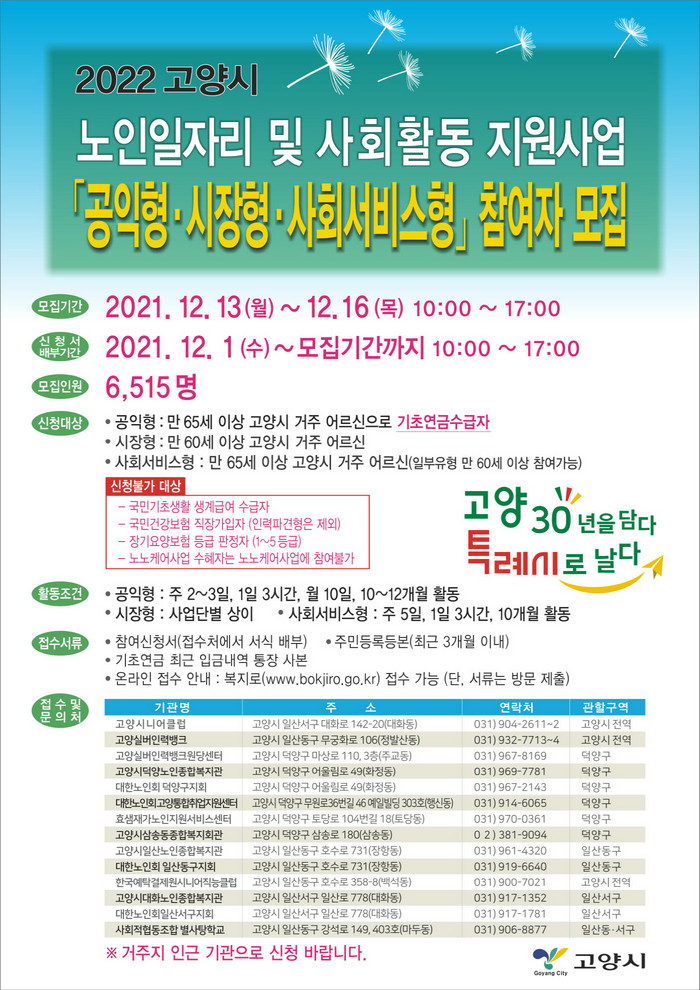 [부자동네타임즈 김인수기자] 고양시는 2022년 노인일자리 및 사회활동 지원 사업을 추진, 지난 1일부터 신청서를 사전 배부 하고 있으며 오는 13일부터 16일까지 접수한다고 밝혔다.