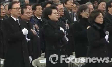 △ 이명박 전 대통령(왼쪽 앞줄)과 김윤옥 여사, 노무현 전 대통령의 부인 권양숙 여사가 고(故) 김영삼 전 대통령의 영결식에 참석해 국기에 대한 경례를 하고 있다. <사진출처= 방송화면 캡처> |