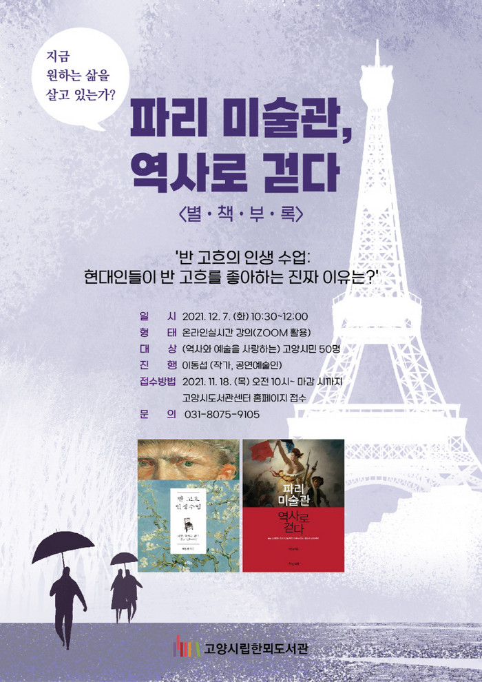 [부자동네타임즈 김인수기자] 고양시 한뫼도서관이 12월 7일부터 역사예술 인문학 수업 파리 미술관, 역사로 걷다 별책부록을 온라인으로 운영한다.