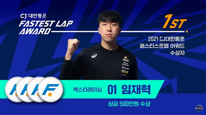 라운드 별로 가장 빠른 랩타임을 기록한 드라이버에게 수여하는 ‘CJ대한통운 FASTEST LAP 배지’는 7라운드 엑스타 레이싱의 임재혁(1분34초365), 8라운드 퍼플모터스포트의 이재연(1분27초203)이 획득했다. 올 시즌 가장 많은 배지를 획득한 선수에게 수여하는 ‘CJ대한통운 FASTEST LAP AWARD’의 영광은 배지 4개를 확보한 엑스타 레이싱의 임재혁에게 돌아갔다. 임재혁에게는 ‘CJ대한통운 FASTEST LAP AWARD’ 상전으로 500만원이 수여됐다.