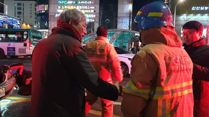 [사진설명] 이동환 국민의힘 고양시장 후보가 2018년 12월 백석역 인근에서 발생한 온수 배관 사고 현장에서 소방서 관계자와 얘기를 나누고 있다.