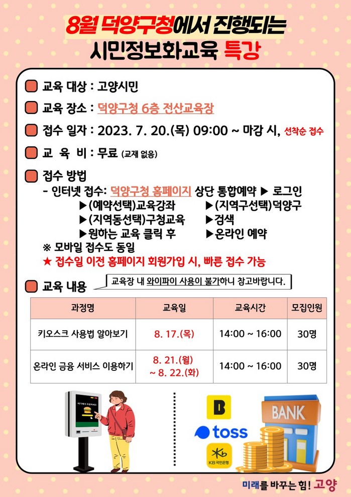 정보화교육 담당자는 “8월에 진행되는 특강은 정규 교육 과정 외 덕양구에서 시민들을 위해 준비한 특별한 과정이다. 이번 교육은 온라인 시대에 발맞춰 키오스크 사용법과 디지털 금융앱 사용을 익히고, 디지털 범죄를 예방하는 방법을 다루고 있으니, 많은 관심과 참여 부탁드린다.”라고 전했다.