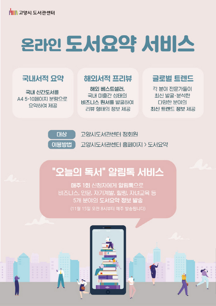 [부자동네타임즈 김인수기자] 고양시 도서관센터는 책에 대한 요약정보를 온라인으로 제공하여 시민들이 스마트한 독서 생활을 할 수 있도록 온라인 도서요약 서비스를 11월 15일부터 시작했다.