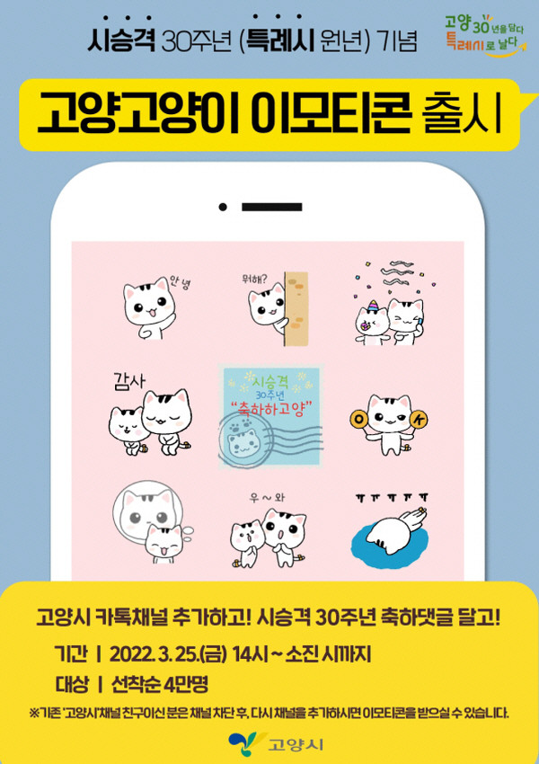 [부자동네타임즈 김인수기자] 고양시가 올해 고양 시승격 30주년과 고양특례시 출범 원년을 맞아 고양시 대표 캐릭터 ‘고양고양이’ 이모티콘 배포 이벤트를 진행한다.